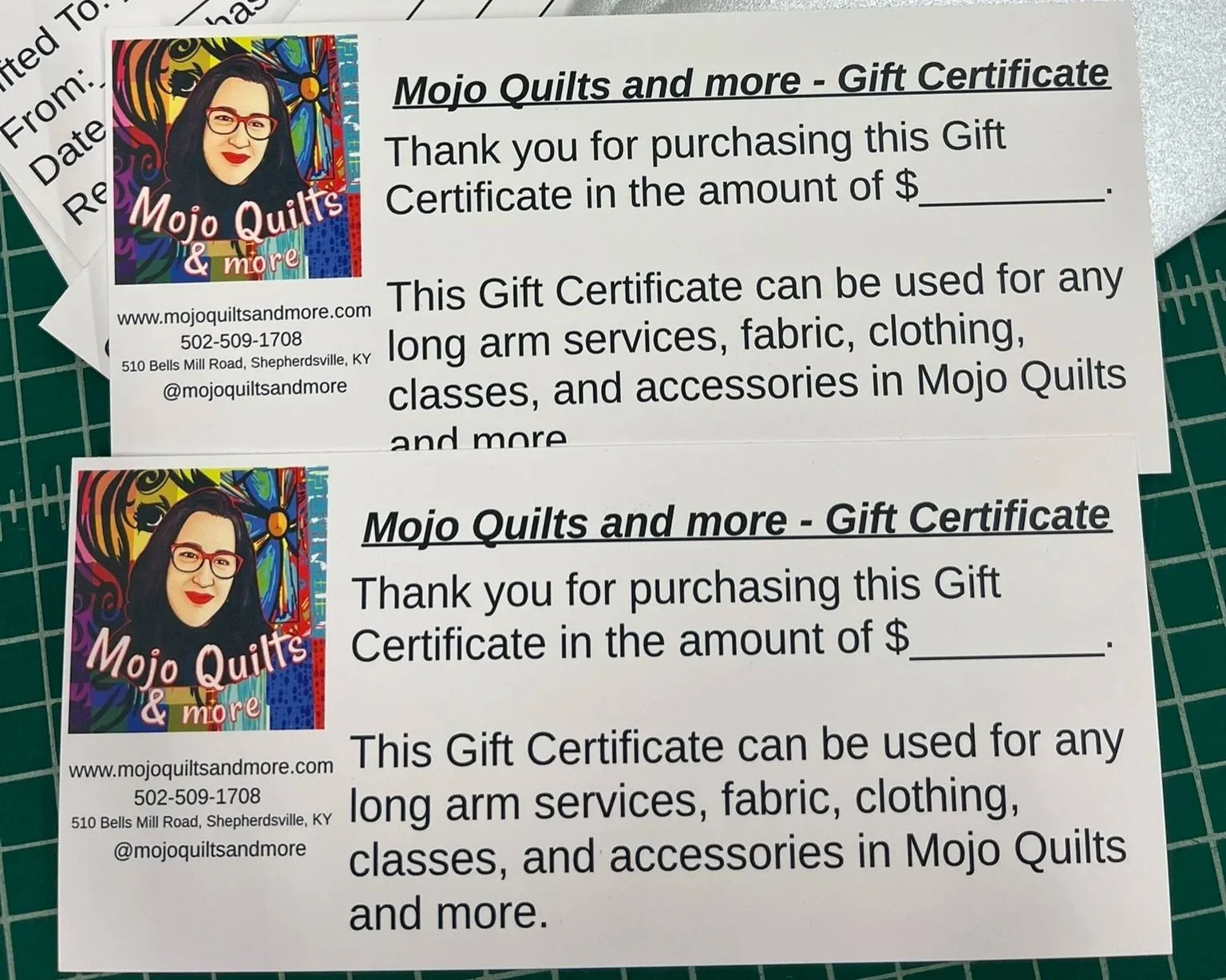Mojo Quilts and more Gift Certificates are now available in denominations of $25!