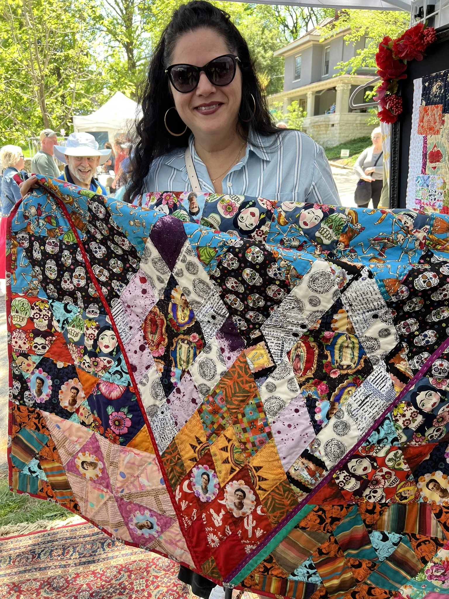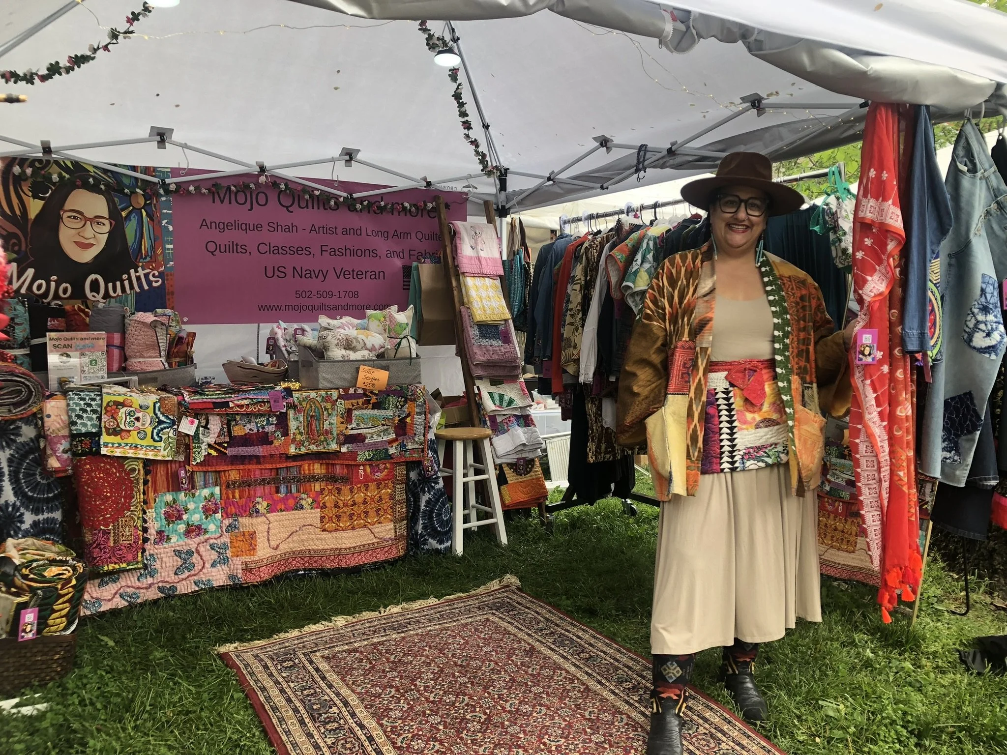 Angelique Shah is a Bronx-born New Yorker now proudly rooted in Shepherdsville, Kentucky, where she creates and quilts in a vibrant studio marked by two hot pink garage doors and a bold, colorful sign — just like her art.