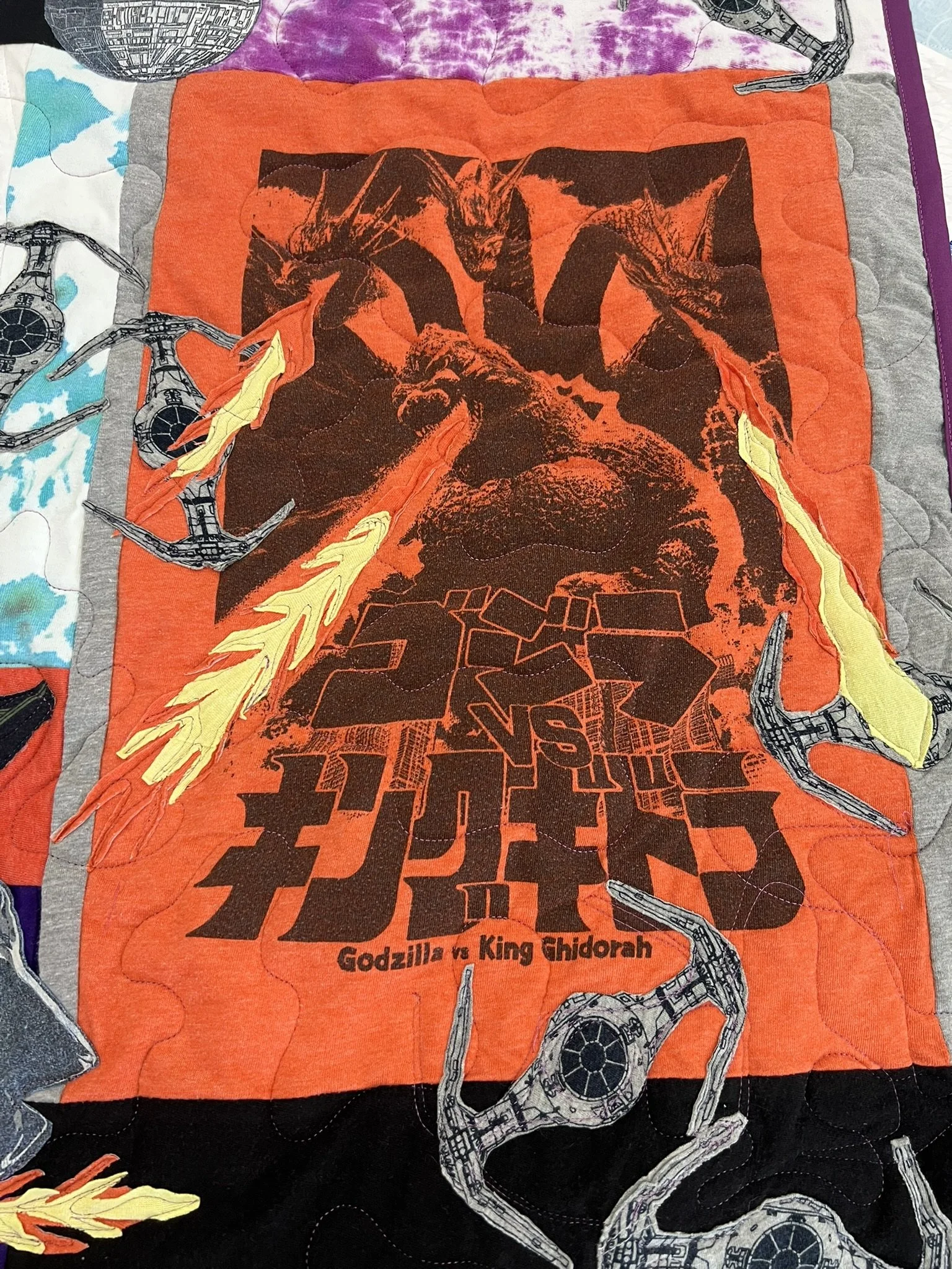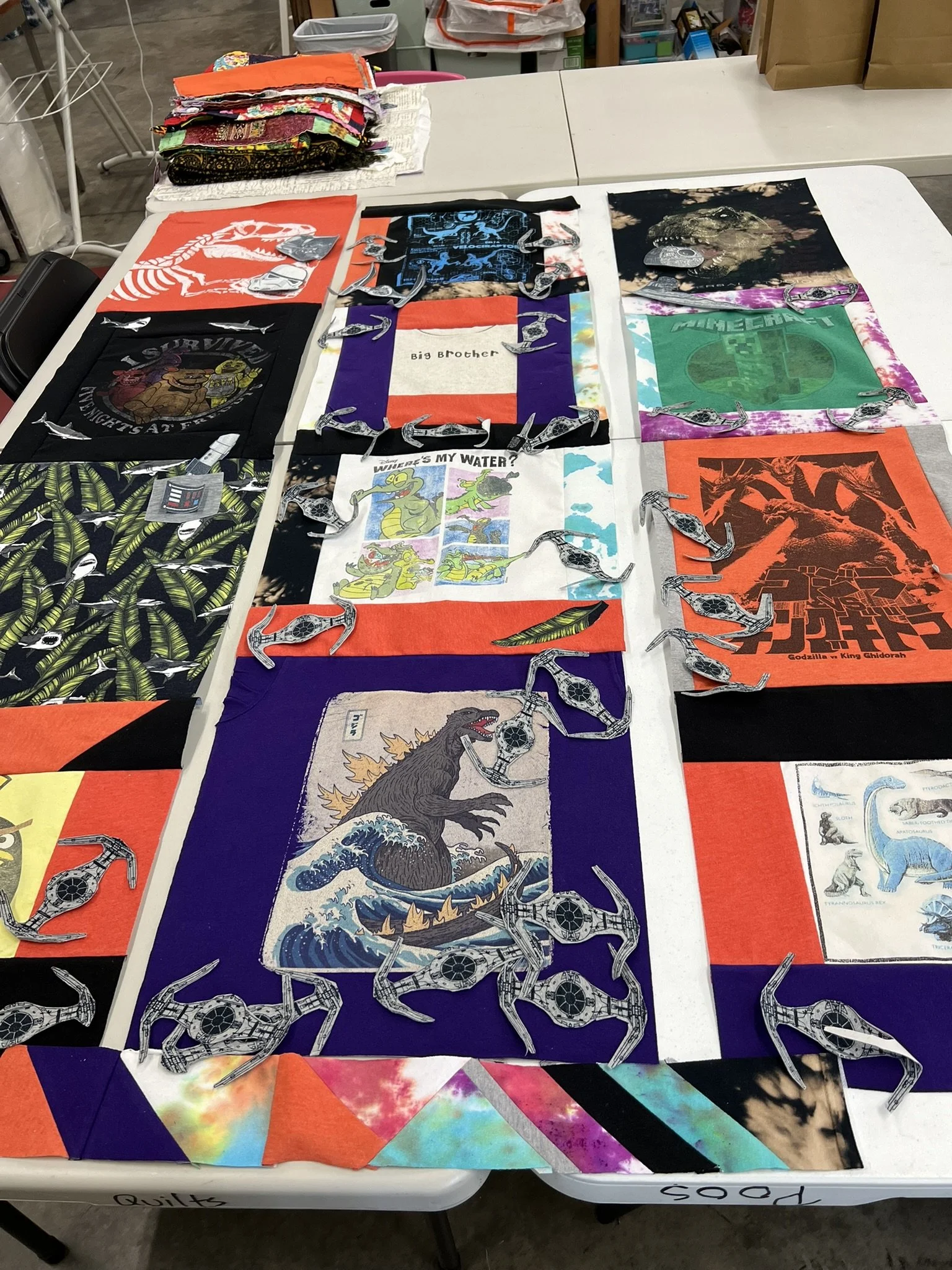 Quilts are laid out in a visually balanced design that reflects the spirit of the shirts